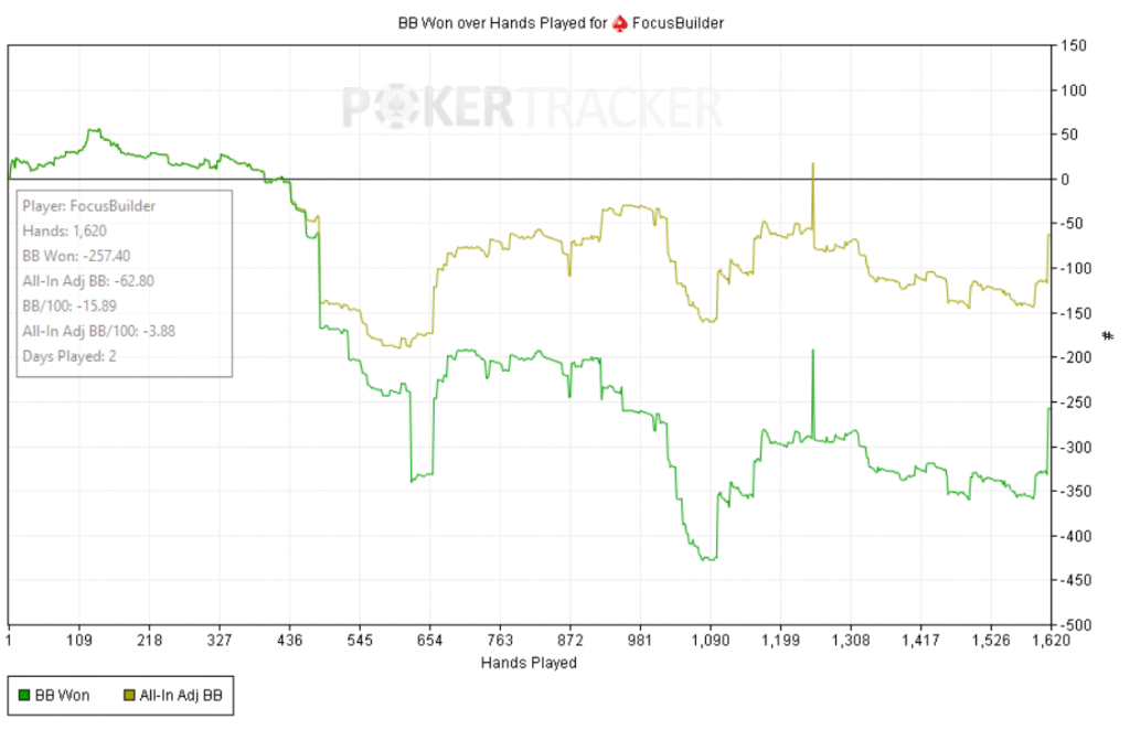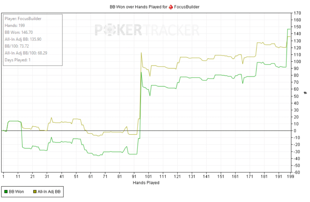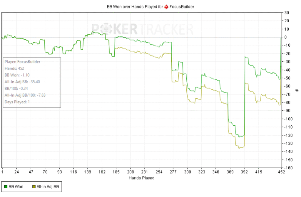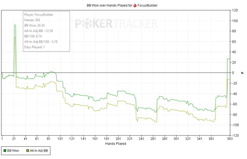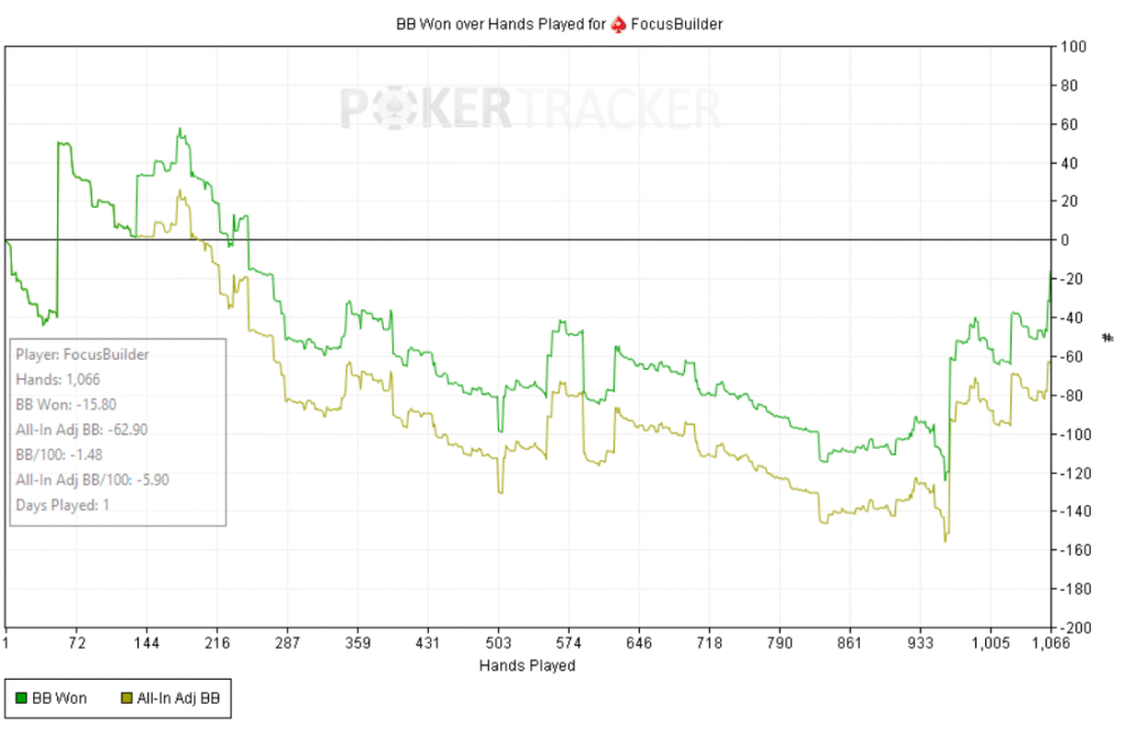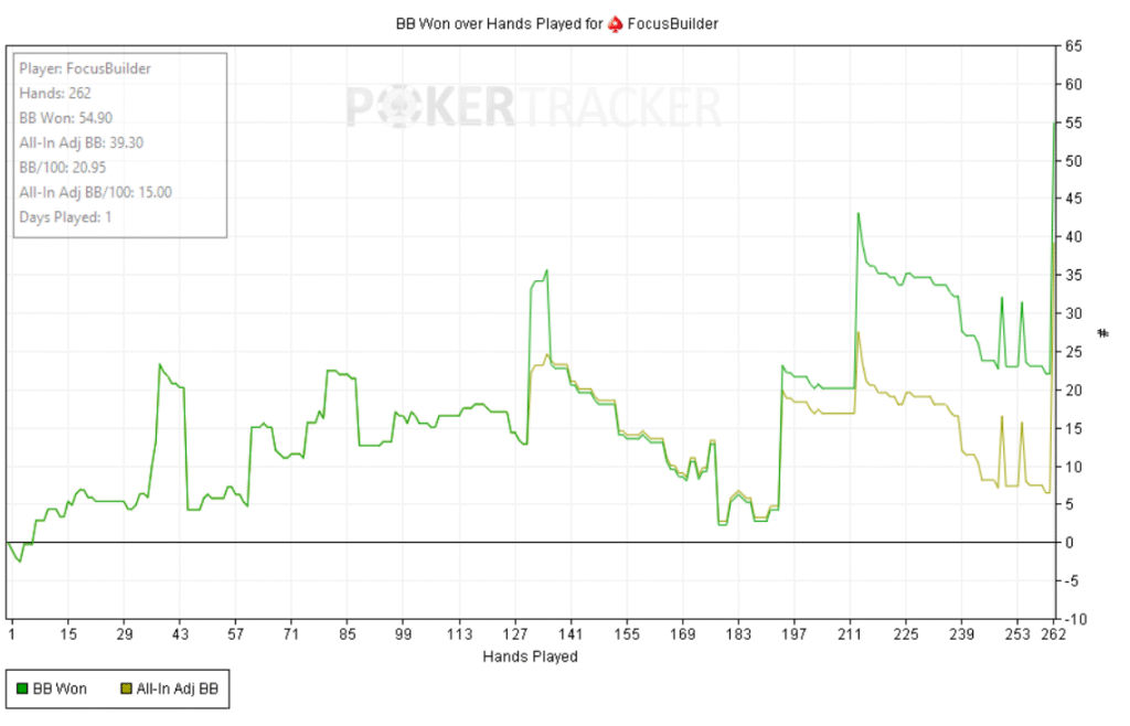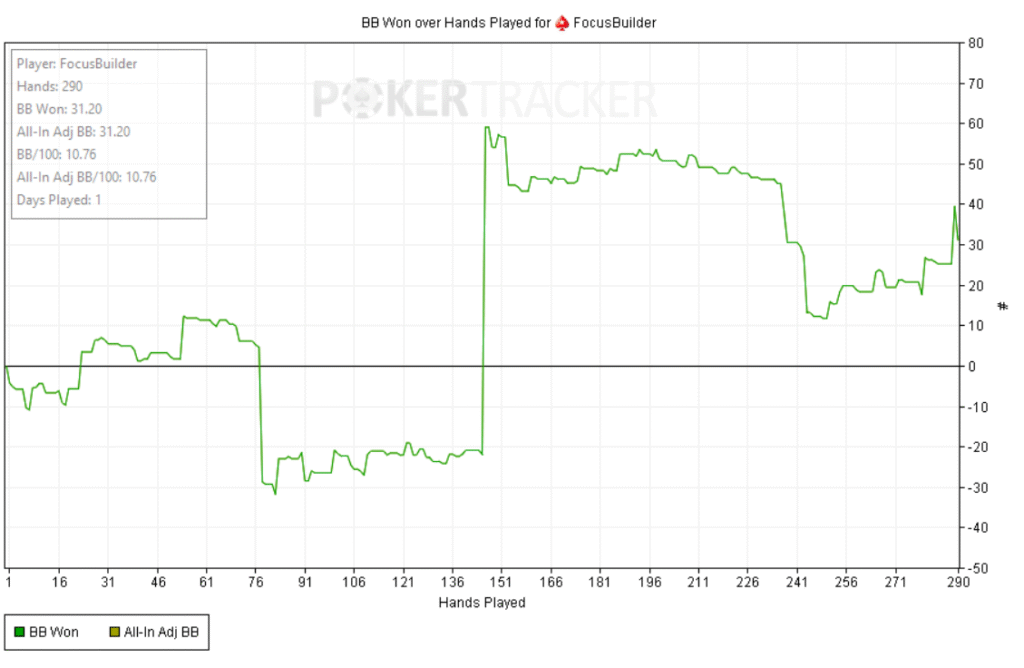 Empecé bien: +60bb ni bien comenzar y a partir de ahí, todo fue cuesta arriba. Abría preflop y me pagaban en cadena, casi sin 3bets; c-bets pagadas y muchos rivers complicados. Como el meta en estos niveles underbluffea poco en river, preferí give up-ear en varios spots antes que pagar fantas.