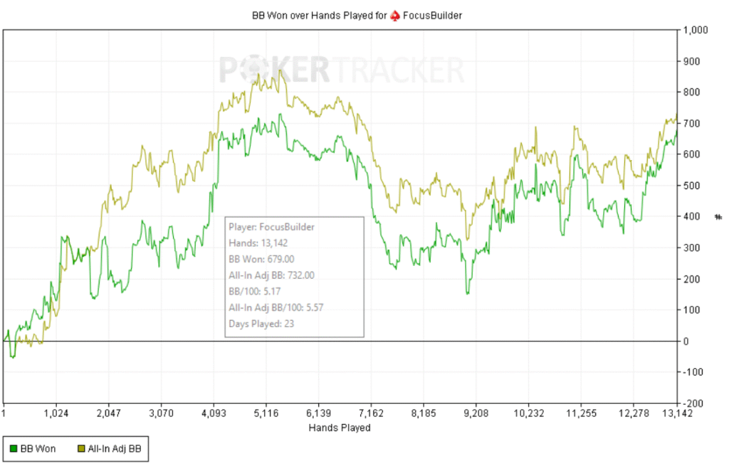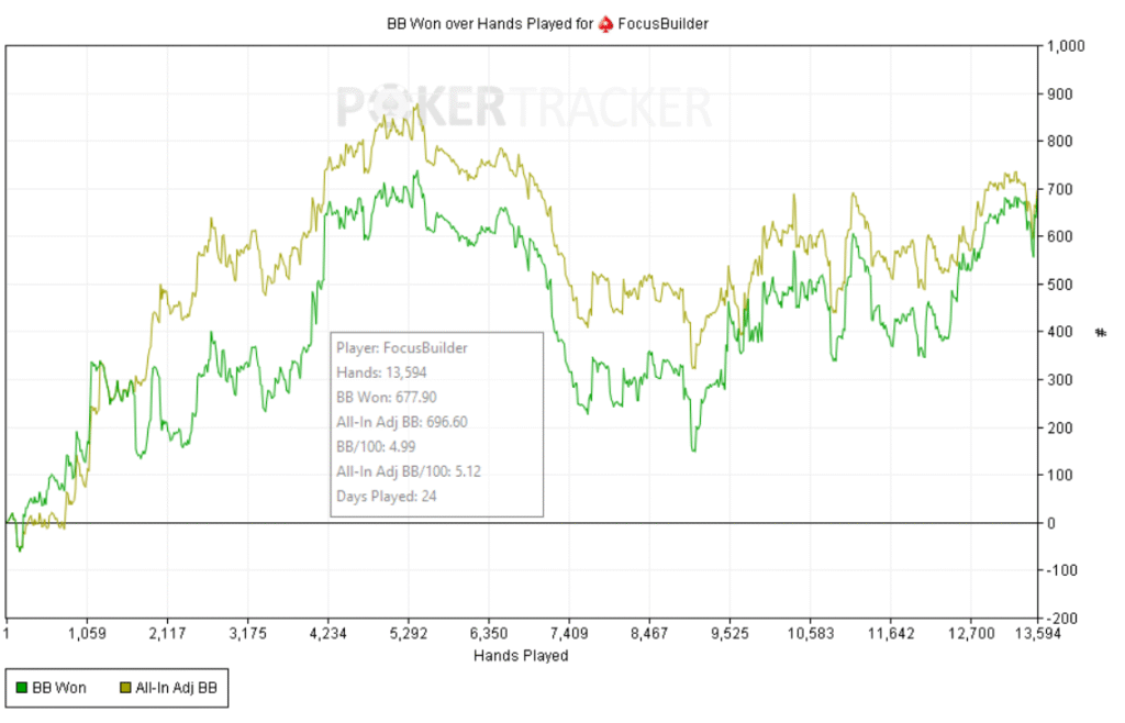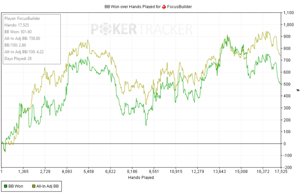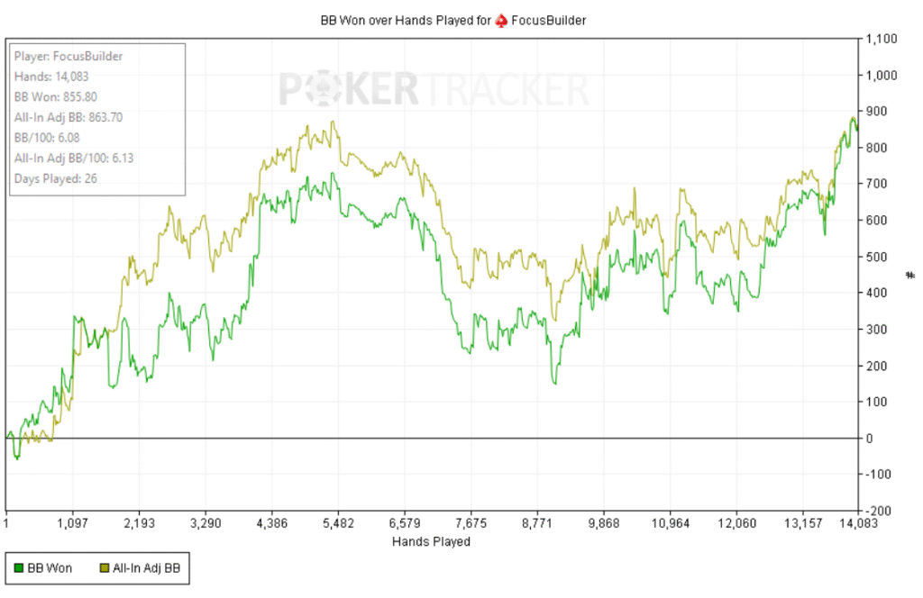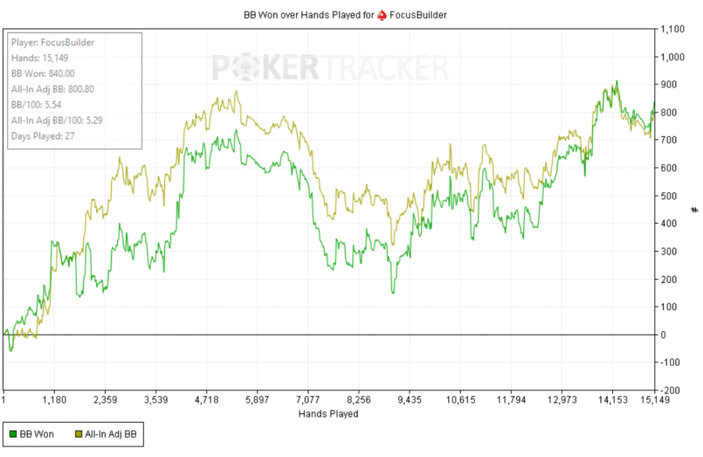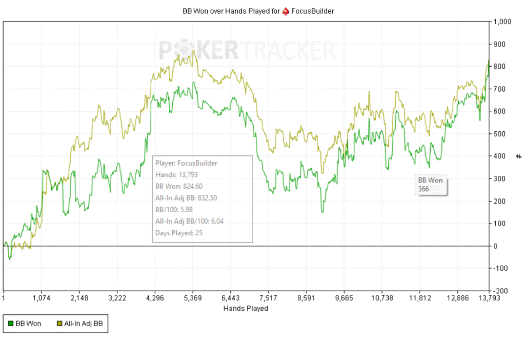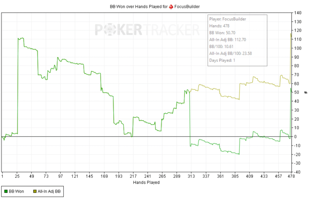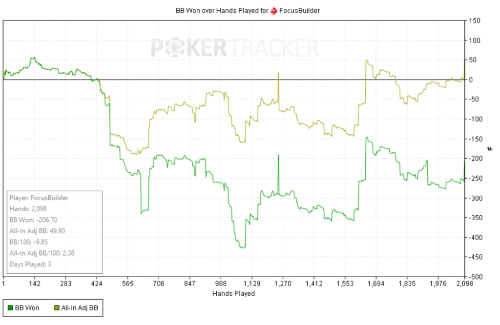 Empecé bien: +60bb ni bien comenzar y a partir de ahí, todo fue cuesta arriba. Abría preflop y me pagaban en cadena, casi sin 3bets; c-bets pagadas y muchos rivers complicados. Como el meta en estos niveles underbluffea poco en river, preferí give up-ear en varios spots antes que pagar fantas.